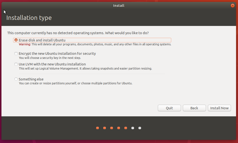 The next steps are to install the Ubuntu operating system on the virtual hard disk. Select install Ubuntu