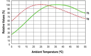 The T5 lamp is designed to work best at 35° C, but reference lamp photometry is taken at 25°C. Yet, many luminaires actually contain lamp compartments that raise air temperature of the lamp. In these cases, the photometry is adjusted so that the total luminaire efficiency is increased. Therefore, for correct calculations, use the 25°C lamp lumen values from the catalog, not the rated lumens at 35°C.