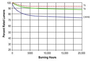 Lamp lumen depreciation is unique to each lamp type and can differ even among similar lamps. In the graph, the lumen depreciation curves for three lamps are shown. Note that T5 fluorescent lamps have a 92% lamp lumen depreciation factor (loss of only 8%) for mean life (8,000 hours), replacement life (14,000 hours) and rated life (20,000 hours).
