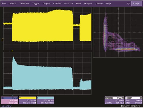 When performing an SOA measurement, the "dangerous" part of the XY plot are points that fall toward the upper right. Those points have high values for both voltage and current. When using a LeCroy instrument for this measurement, a scope user can place a cursor on the XY plot and move it around to any points of interest. The cursor will also appear on the voltage vs. time and current vs. time waveforms on the left side of the screen. This unique feature of LeCroy oscilloscopes is very useful in troubleshooting SOA problems. The instrument will show whether the worrisome points of the SOA plot come immediately at the start of the measurement, possibly indicating a problem with inrush current; or whether they come later, which could mean a problem related to step response for a change in load.