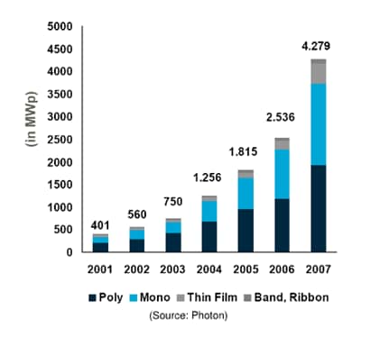 All the large solar cell manufacturers are building large factories to participate in the strong momentum that this market shows. But as much as external factors are driving the market, this market is, at the same time, characterized by immense technological developments, and improvements in cell efficiency. In fact, market development has been so strong that a shortage in one of the basic materials has happened, in raw silicon, the same base material the semiconductor industry also needs. Silicon is one of the most common elements on the earth, but the process to clean this element is extremely time-consuming and expensive. As shown in the diagram above, thin-film cells that use much less silicon (or other materials) have gained in momentum, despite the fact that their efficiencies are lower than the mono-crystalline cells.