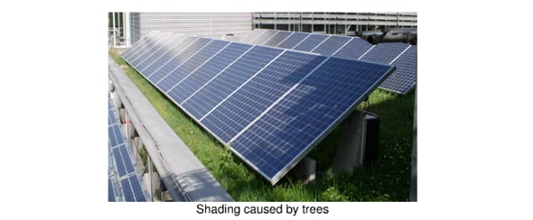 The output of PV systems can suffer from various issues. Most of them have to do with the way the light reaches the cells, like cast shadows, diffuse shading, or dirt or other particles on the modules. The picture below shows how even small plants can cause a significant loss in output power: