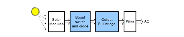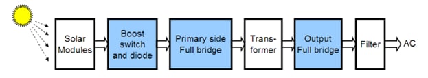 Inverters come in different topologies, depending on whether isolation is needed or not. The above block diagram shows a transformer-less topology that is instrumental in optimizing efficiency. When isolation is required, a transformer needs to be introduced: