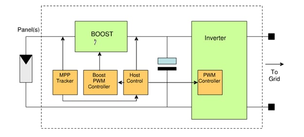 As shown above, the front end of the inverter has a distinct task. In order for the back end to perform the DC-to-AC conversion with high efficiency, it is best to "feed" it with a DC voltage that is by a certain margin higher than the maximum required output voltage, so that the backend only needs to perform a step-down function. But the output voltage of one panel is typically 50 to 80V, so several panels must be connected in a series to achieve a high input voltage. And, the voltage will depend on the solar radiation density - very quickly, a pretty complex situation is achieved. The challenges are: