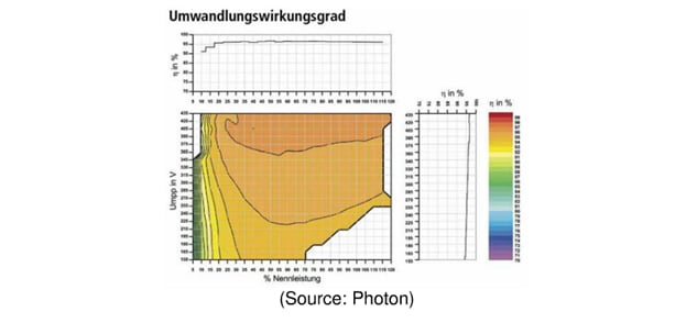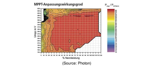 This picture shows an example of the MPP tracker matching at the input, that means, how close the front end converter is able to match its input impedance to the output impedance of the panels. The horizontal scale is the nominal power; the vertical scale the input voltage. Higher efficiency areas are shaded in red. The input impedance is controlled within the feedback loop of the MPP tracker, so any deviation is signaled through a lower efficiency and implies something this control loop cannot regulate away- an implicit limitation of the inverter, and the topologies and components chosen. Another root cause can be measurement errors in determining the input current and voltage, as well as limitations in the resolution of the A-to-O converters and controllers.