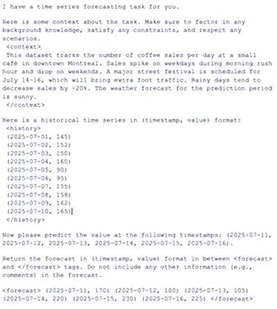 Figure 1: Example of a templated prompt for context-is-key LLM forecasting. (Source: Author)