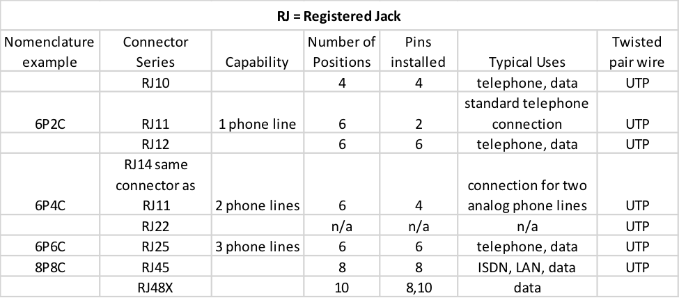 Table 1: RJ connector nomenclatures