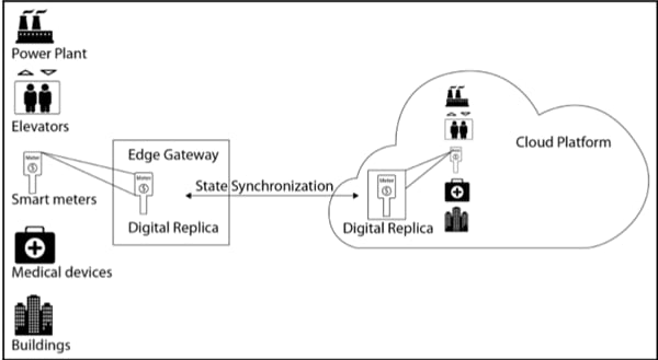 Figure 1: DM using a state-synchronized digital replica at the edge and in the cloud. (Source: Practical Industrial IoT Security, Packt)