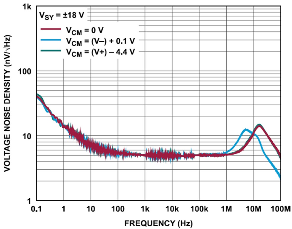 Recognizing this demand, Analog Devices developed the ADA4620 family of 36V high-precision, low-noise JFET op-amps, available in single- and dual-channel variants. These op-amps feature rail-to-rail output with 16.5MHz bandwidth, plus very low offset voltage and offset voltage drift, input bias current, 1/f noise, voltage noise density (Figure 1), total harmonic distortion (THD), and supply current. Furthermore, they feature a high slew rate of 32V/μs with a wide power supply range of 4.5V to 36V for a single supply and ±2.25V to ±18V for a dual supply while exhibiting no phase reversal and absolute unity-gain stability.