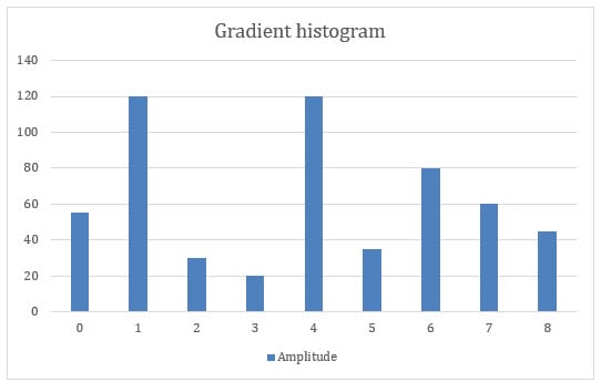 The image can be split into as many bins as necessary. For example, when it is divided into nine bins, i.e., when a gradient histogram with nine directions per cell is used, each bin covers an area of 20 degrees. Amplitudes (calculated above) are inserted into each bin, and the final sum of the amplitudes in each bin corresponds to the vertical axis of the histogram, while the horizontal axis corresponds to the range of bin values, in this case (0, 8).
