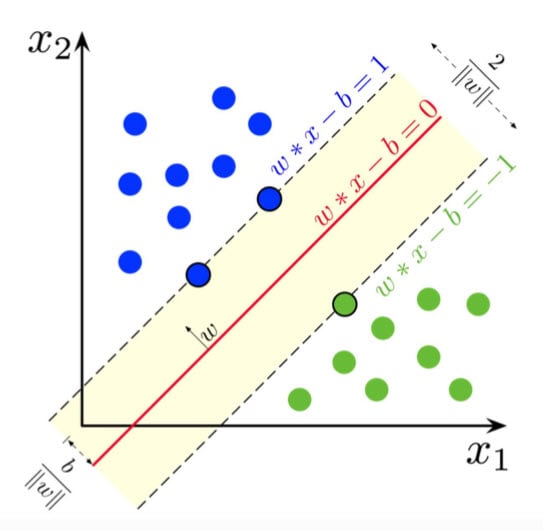 Figure 9: The red line corresponds to the hyperplane, the points on either side of the dashed line are support vectors, and the calculated value is 1 (positive class) or -1 (negative class). The blue point corresponds to a positive sample, and the green point corresponds to a negative sample. The goal is to find the value exhibiting the largest distance between the dashed lines, since a larger distance indicates a better binary classification model. (Source: Wikipedia)
