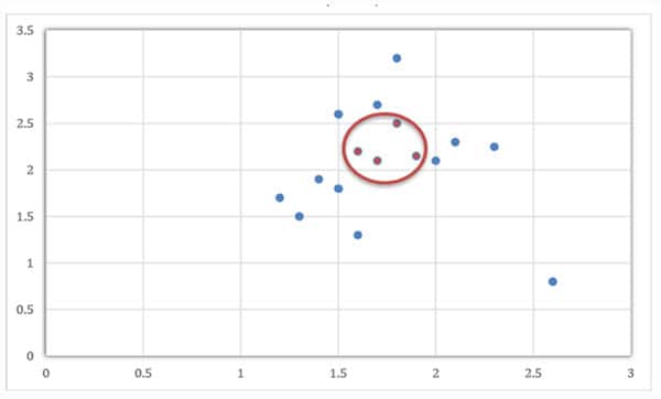 Figure 10: The points in the red circle are linearly inseparable from the points in blue in two-dimensional space, so a kernel function is needed to map the points into a higher-dimensional coordinate system. (Source: Original artwork created for Mouser)