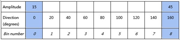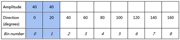In this article, we will use three tables to explain how interpolation is carried out. In each table, the first row shows the calculated amplitude and the second row specifies the directional value of the bin which is obtained by dividing 180 degrees by the number of defined bins. The third row shows the bin sequence numbers, starting with 0.