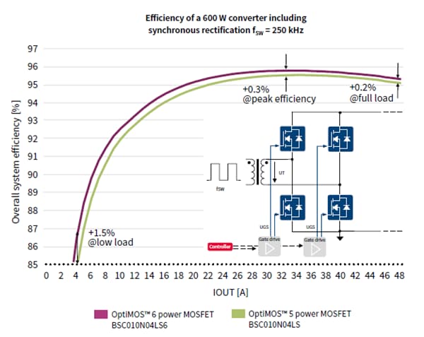 In SMPS applications, OptiMOS 6 is ideal for optimizing efficiency over a wide range of output power, avoiding the trade-off between low- and high-load conditions. At the low-output power range, the switching losses dominate the efficiency curve. The OptiMOS 6 Power MOSFET BSC010N04LS6 achieves greater efficiency in this range compared to the same RDS(on) OptiMOS 5 because of its superior switching performance. Moreover, at a higher output power, where the RDS(on) losses are getting more dominant, the OptiMOS 6 can maintain the advantage, leading to better performance throughout the whole operating range (Figure 2).