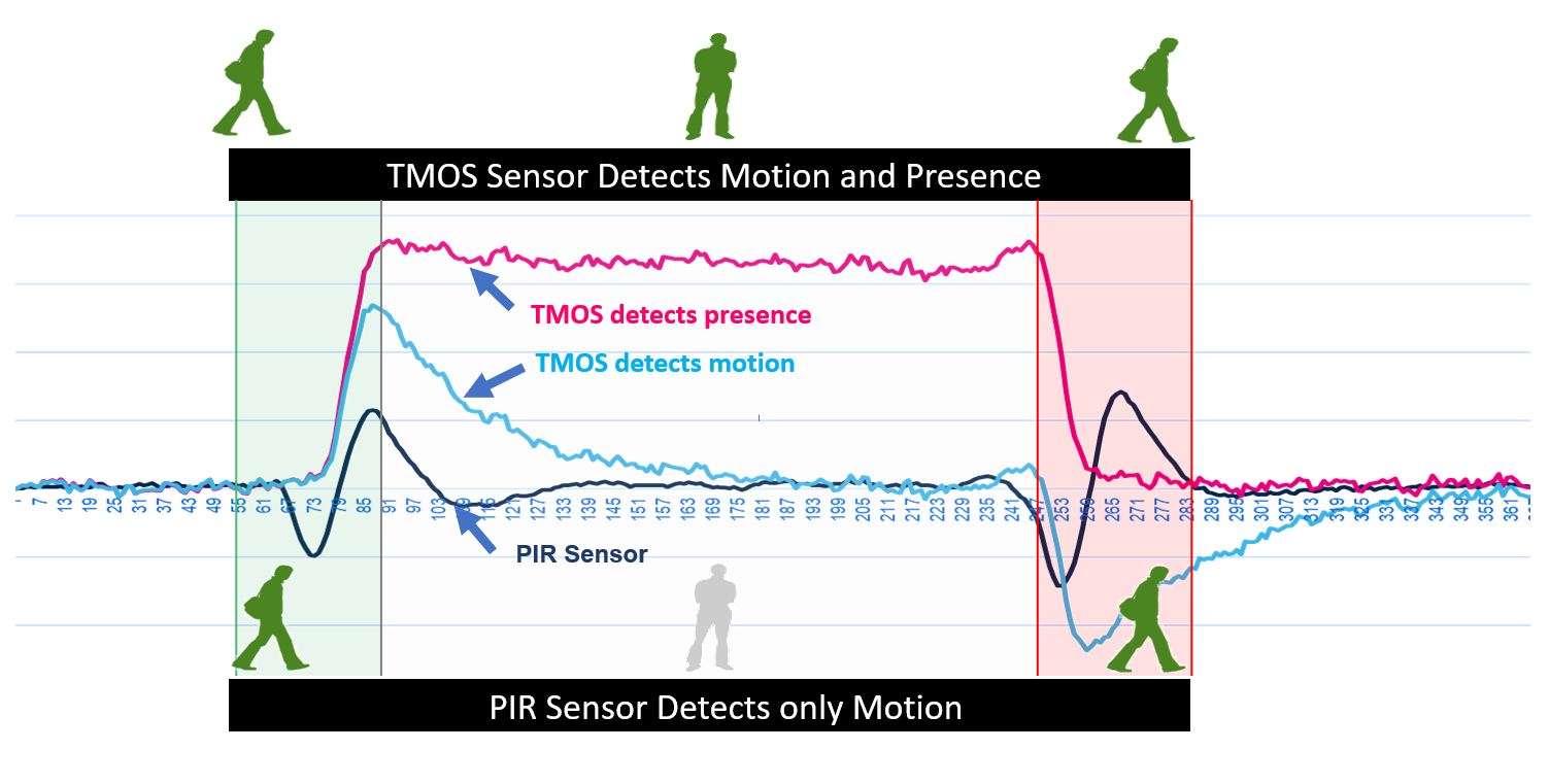 In comparison to PIR-based sensors, TMOS technology likewise detects motion as a person enters or leaves the FoV, but it also detects presence (Figure 1). If a person stands still, the PIR sensor does not recognize the person and immediately drops its output signal. This is where TMOS technology shows its advantages.
