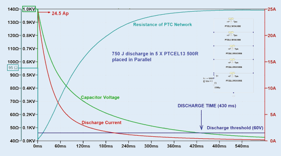 Figure 4: This graph shows a typical capacitor discharge process through a network of PTC thermistors, with the key aspects being the initial peak current limitation followed by the increasing resistance as the thermistor’s voltage reduces during heat up, leading to a controlled and safe dissipation of the stored energy. (Source: Vishay)