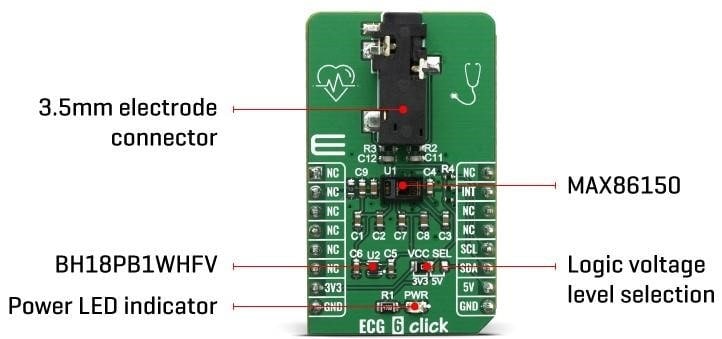 Figure 2: The MikroE ECG Click board is used for the development of electrocardiogram and heart-rate applications. (Mouser Electronics)