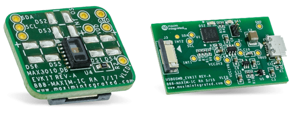 The sensor can be evaluated using the MAX30102 Evaluation Kit , a combination of the motherboard USBOSMB and the daughterboard MAX30102DBEVKIT that includes the MAX30102 and an accelerometer (Figure 3). The evaluation kit is powered by the USB supply to generate +1.8V for the sensor and +4.5V for the internal LEDs of the MAX30102, and +3.3V for the accelerometer.
