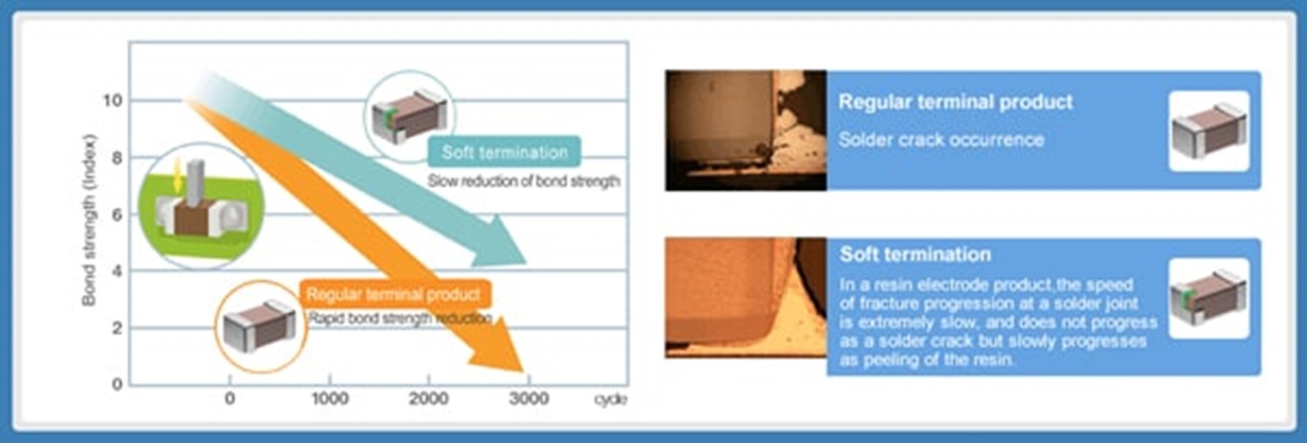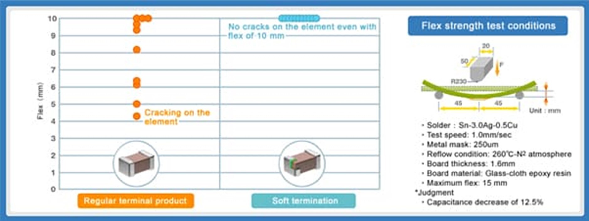 Figure 4: Comparison between a normal and soft termination product showing the decrease in flexural strength. (Source TDK)