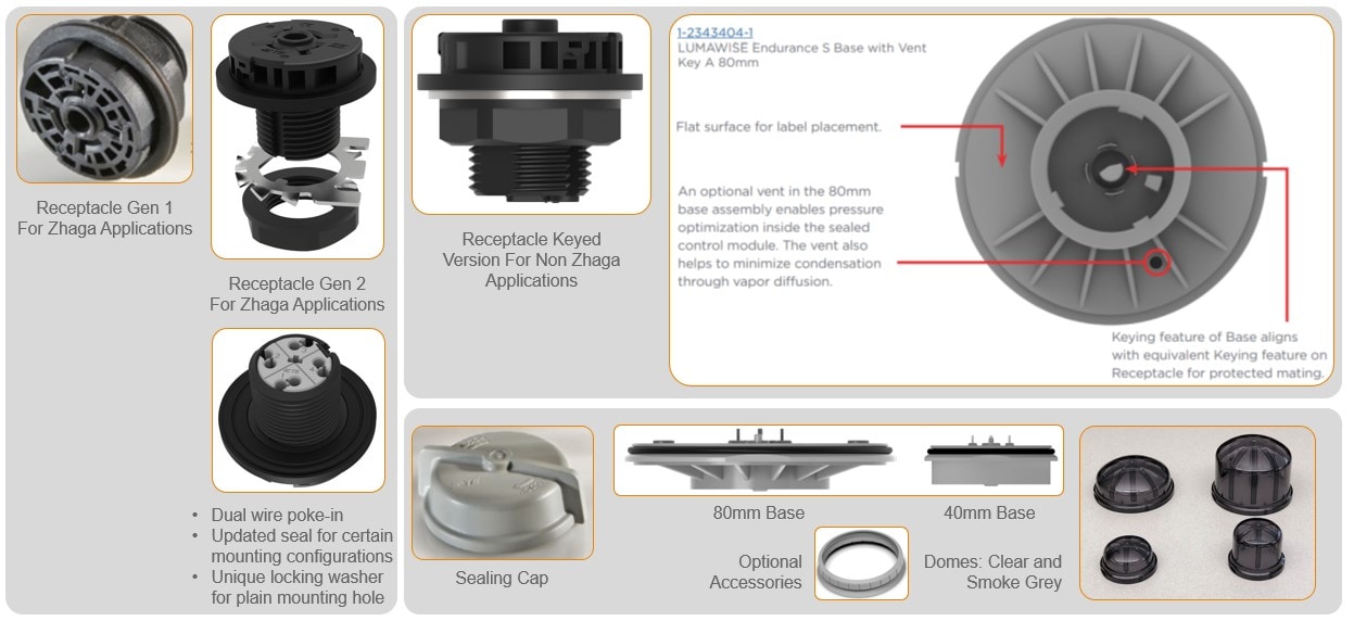 TE released the second-generation version of that product. Featuring dual-wire poke-in, an updated seal for certain mounting configurations and a unique locking washer for a featureless plain mounting hole. The dual wire poke-in is designed specifically for the two-node architecture, allowing daisy chaining to crate the D4i bus and 24VDC rail. This receptacle is for Zhaga applications that use the D4i protocol. For where people have a different application or a proprietary communication protocol, TE Connectivity has a keyed version. This is to keep the Zhaga architecture clean and ensure the promise of interoperability. TE Connectivity also supplies a sealing cap, bases, and domes in different sizes.