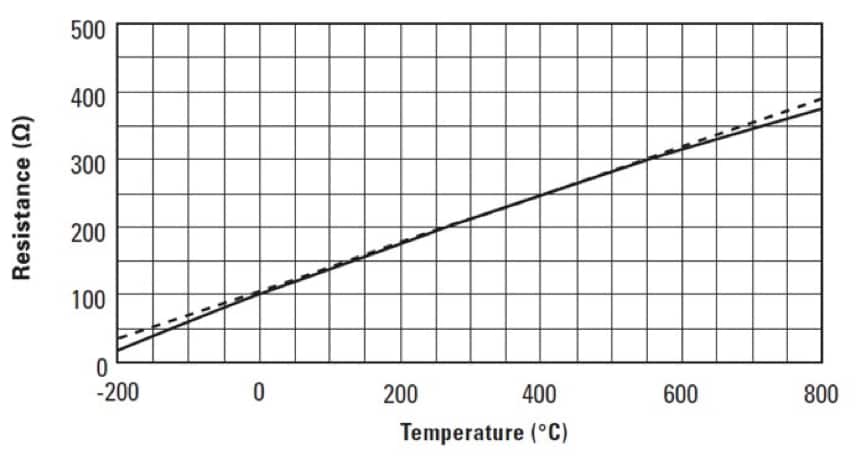 When measuring the resistance of an RTD while varying its temperature, the response is almost linear, behaving like a resistor. As shown in Figure 1, the RTD’s resistance curve is several degrees out of linearity (with a straight line shown for reference) but is highly predictable and repeatable. To compensate for this slight nonlinearity, most designers digitize the measured resistance value and use a lookup table within the microcontroller to apply correction factors. This repeatability and stability over a wide temperature range (roughly -250°C to +750°C) makes RTDs useful in high-precision applications, including measuring temperature of fluid or gas in pipes and tanks.