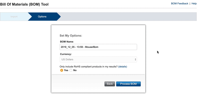 Seçenekleriniz kesinleştiğinde Mouser'ın Ürün Ağacı Aracı Ürün Ağacınızdaki ürünleri eşleştirmeye başlayacaktır. İşlem süresi, ürün ağacınızın boyutuna bağlı olarak çok kısa bir süreyle birkaç dakika arasında değişebilir.
