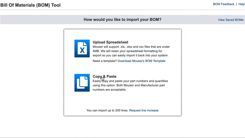 Mouser'ın Ürün Ağacı Aracı, verilerinizi iki şekilde içe aktarmanıza olanak tanır: