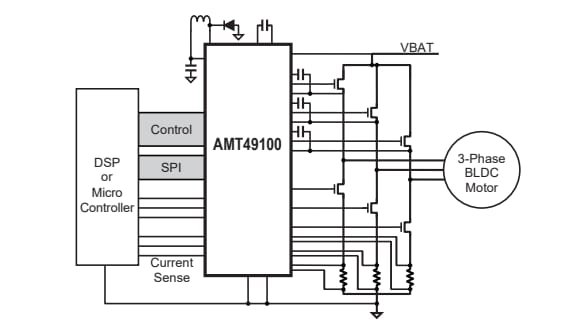 Allegro MicroSystems AMT49100 and AMT49101 Three-Phase MOSFET Drivers control MOSFETs connected in a 3-phase bridge arrangement and are designed for 48V automotive power applications. These drivers feature a fixed-frequency buck converter that provides a regulated gate drive and bootstrap charge voltage over the 10V to 80V supply voltage range. The AMT49100 and AMT49101 drivers provide full control over all six power MOSFETs in the 3-phase bridge. This allows the motors to be driven with block communication or sinusoidal excitation. These MOSFET drivers feature cross-conduction protection with adjustable dead time, SPI-compatible serial interface, extensive programmable diagnostics, three programmable current sense amplifiers, and programmable control sense amplifiers.The AMT49100 and AMT49101 MOSFET drivers use the integrated crossover control and optional programmable dead time to protect the power MOSFETs from shoot-through. These MOSFET drivers feature integrated diagnostics that provide indications of multiple internal faults, system faults, and power bridge faults. This can be configured to protect the power MOSFETs under most short circuit conditions. The AMT49100 and AMT49101 MOSFET drivers are automotive AEC-Q100 qualified and come in a 48-pin QFP package with an exposed thermal pad.