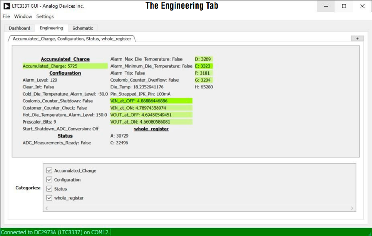 The QuikEval software provides a GUI that enables users to configure the target device and view its status. The GUI is divided into a Dashboard tab, an Engineering tab, and a Schematic tab. The Dashboard tab shows a graphical representation of the LTC3337’s core functionality. The Engineering tab shows all registers and is intended to be used for lower-level development and debugging purposes. The Schematic tab displays the schematic for reference.