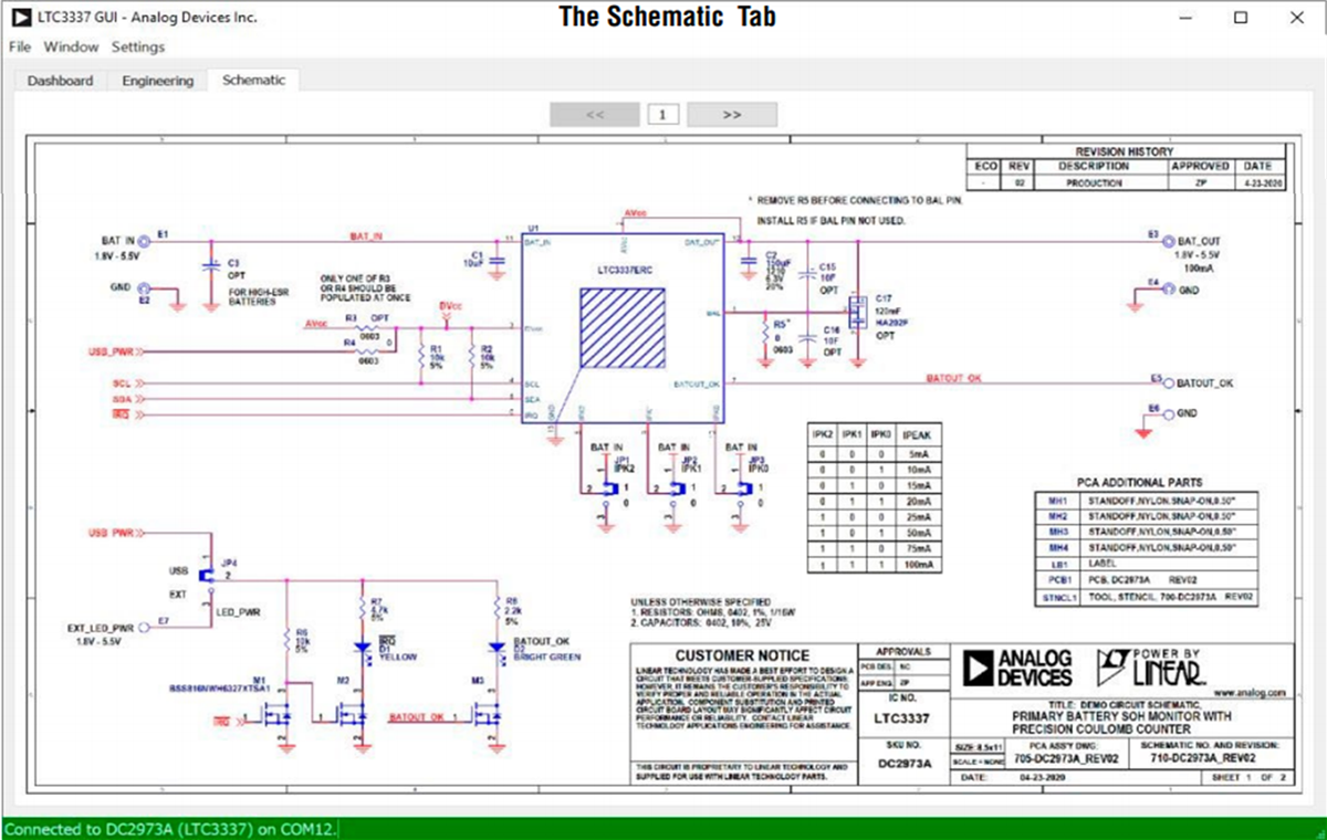 The Analog Devices Inc. DC2973A demonstrates a simple layout for the highest-power configuration of the LTC3337. The circuit can be reduced for lower IPEAK levels. The Demonstration Board can be connected directly to a PC using a micro USB cable to run a GUI and configure a simple Battery State of Charge (SOC) monitor. Source code for the GUI is available and can be used as a starting point for LTC3337 firmware development.