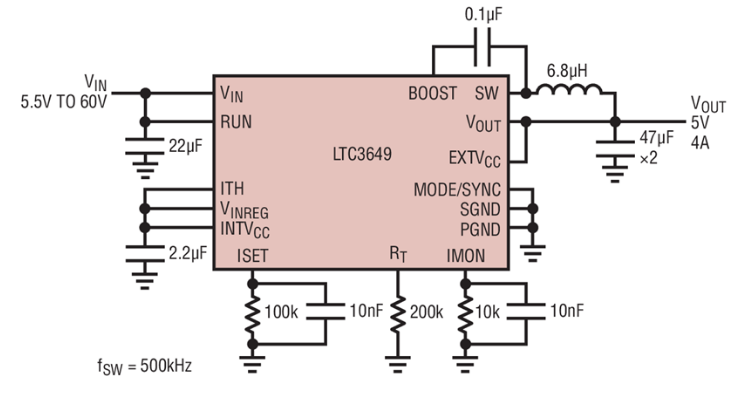 Analog Devices Inc. LTC7149 and LTC3649 offer a peak current mode architecture that allows for fast transient response with inherent cycle-to-cycle current limit protection. LTC3623 and LTC3600 has operating frequency from 200kHz to 4MHz, and has unique constant on-time architecture that is ideal for high step-down ratio applications.