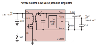 Analog Devices Inc. LTM8067 and LTM8068 μModule® DC/DC Converters are 2kVAC isolated flyback power modules. Included in the package are the switching controller, power switches, transformer, LDO, and all support components. These Analog Devices converters operate over a 2.8V to 40V input voltage range and support a 2.5V to 18V output voltage range, set by a single resistor.Features