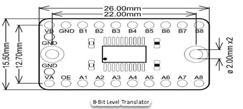 DFRobot Fermion: 4-Bit and 8-Bit Level Translators are level conversion modules that feature strong level compatibility and fast signal conversion speed. These translators use two separate configurable power-supply rails. The A port is designed to track VCCA, port B is designed to track VCCB, and VCCA must be less than or equal to VCCB. These translators offer low power consumption, bidirectional automatic conversion, and no direct control are needed. This module can be used in the level conversion of communication protocols such as I2C, UART, SPI, and OneWire. The 4-Bit and 8-Bit level translators operate at -30°C to 75°C temperature range.Features