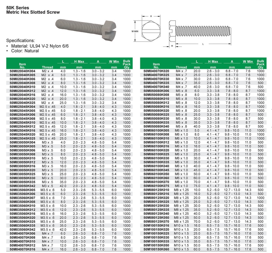 Essentra Components 50K Series Metric Hex Slotted Screws feature UL 94V-2 nylon 6/6 construction and are ideal for difficult-to-reach or awkwardly located sockets. These screws are designed to mate with machine threads and help secure components to assemblies, and their slim head and hexagonal shape make them suitable for various spaces. The screws are available with or without a flange at the base of the screw head. Essentra Components 50K Series Metric Hex Slotted Screws are lightweight and offer a vibration-, chemical-, electrical-, and corrosion-resistant design.Features