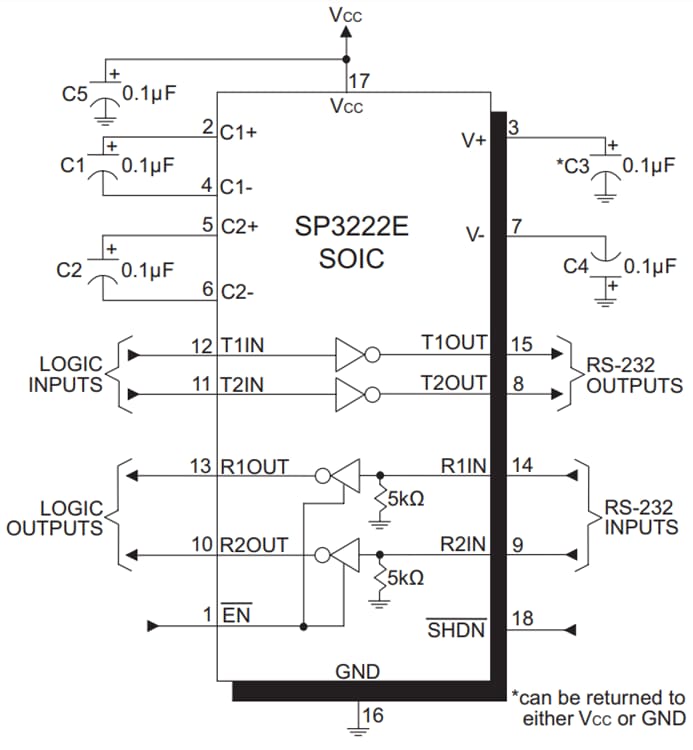MaxLinear SP3222E and SP3232E RS-232 Transceivers are intended for portable or hand-held applications such as notebooks or palmtop computers. The SP3222E and SP3232E have a high-efficiency, charge-pump power supply that requires only 0.1µF capacitors in 3.3V operation. This charge pump allows the these transceivers to deliver true RS-232 performance from a single power supply ranging from 3.0V to 5.5V. The MaxLinear SP3222E and SP3232E are 2-driver/2-receiver devices. This series is ideal for portable or hand-held applications such as notebooks or palmtop computers.The ESD tolerance of the SP3222E and SP3232E devices is over ±15kV for both the Human Body Model and IEC61000-4-2 Air discharge test methods. The SP3222E device has a low-power shutdown mode where the devices’ driver outputs and charge pumps are disabled. During a shutdown, the supply current falls to less than 1µA.