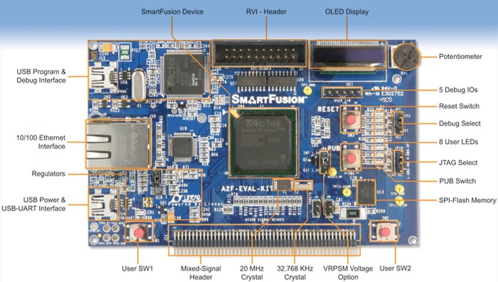 Microsemi SmartFusion™ Evaluation KitThe Microsemi SmartFusion™ Evaluation Kit supports the SmartFusion mixed-signal FPGAs that feature integrated FPGA, an ARM Cortex™-M3 processor, and programmable analog. The Microsemi SmartFusion Evaluation Kit comes with free one-year Libero Integrated Design Environment (IDE) software and Gold license with SoftConsole for program and debug. The evaluation board included with this Microsemi SmartFusion kit features Ethernet interface, USB port for power and HyperTerminal, USB port for programming and debug, J-Link header for debug, Mixed-signal header, SPI flash (off-chip memory), Reset and 2 user switches, 8 LEDs, POT for voltage / current monitor, temperature monitor, and an Organic light-emitting diode (OLED). ![]() |