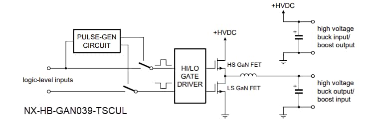 The NX-HB-GAN111UL Evaluation Board provides the elements of a simple buck or boost converter using GAN111-650WSB GaN FET. This board enables the basic study of the switching characteristics and efficiency achievable with 650V GaN FETs. The NX-HB-GAN111UL evaluation board features selection jumpers that allow the use of a single logic input or separate high/low level inputs. The high-voltage input and output can operate at up to 400VDC, with a power output of up to 2kW.