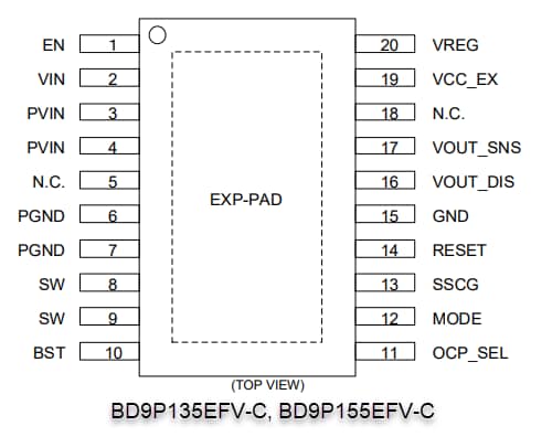 ROHM Semiconductor BD9P Series Single 2.2MHz Buck DC-DC Converters are current mode synchronous buck DC/DC converters integrating power MOSFETs. These converters feature protection against input Under-Voltage Lockout (UVLO), Thermal Shut Down (TSD), output over-voltage, and short circuit. The BD9P1x-C series buck DC-DC converters offer selectable spread-spectrum switching and external synchronization function. These DC-DC converters operate at 3.5V to 40V supply voltage range and -40°C to +125°C temperature range. ROHM Semiconductor BD9P Converters are suitable for automotive- and consumer-powered supplies.Features
