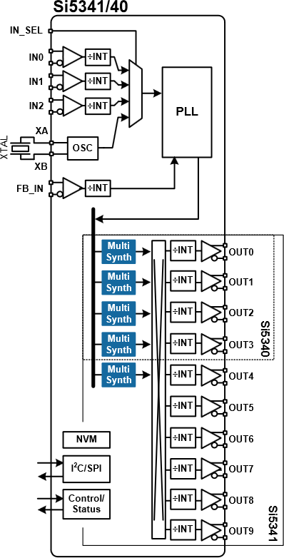 Skyworks Solutions Inc. Si534x/Si538x clock devices are designed to meet the exacting specifications and high-performance requirements of Internet Infrastructure. These ultra-low-jitter clock devices reduce cost and complexity for a wide range of timing applications. Skyworks Si534x/Si538x clock devices provide fast, free and easy customization for any frequency on any output with no compromise on performance or specifications. This includes any frequency up to 800MHz with 0ppm frequency synthesis, across 4 inputs and 10 outputs with any voltage and phase jitter as low as 100fs(RMS). Skyworks clocks enable a true "clock tree on-chip" solution.Features
