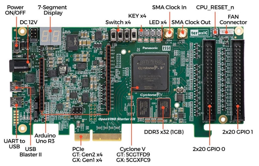 Terasic Technologies OpenVINO GT Edition Starter Kits present a robust hardware design platform built around the Intel® Cyclone® V FPGA. These kits provide a powerful platform of reconfigurable power with a high-performance and low-power processing system. The kits are equipped with PCIe Gen2x4, high-speed DDR3 memory, GPIO, Arduino, and more to help develop mainstream applications, OpenCL applications based on PCIe, and a wide range of high-speed connectivity applications. Terasic Technologies OpenVINO GT Edition Starter Kits include all the necessary tools to use the board in conjunction with a computer that runs Microsoft Windows 7 or later.Features