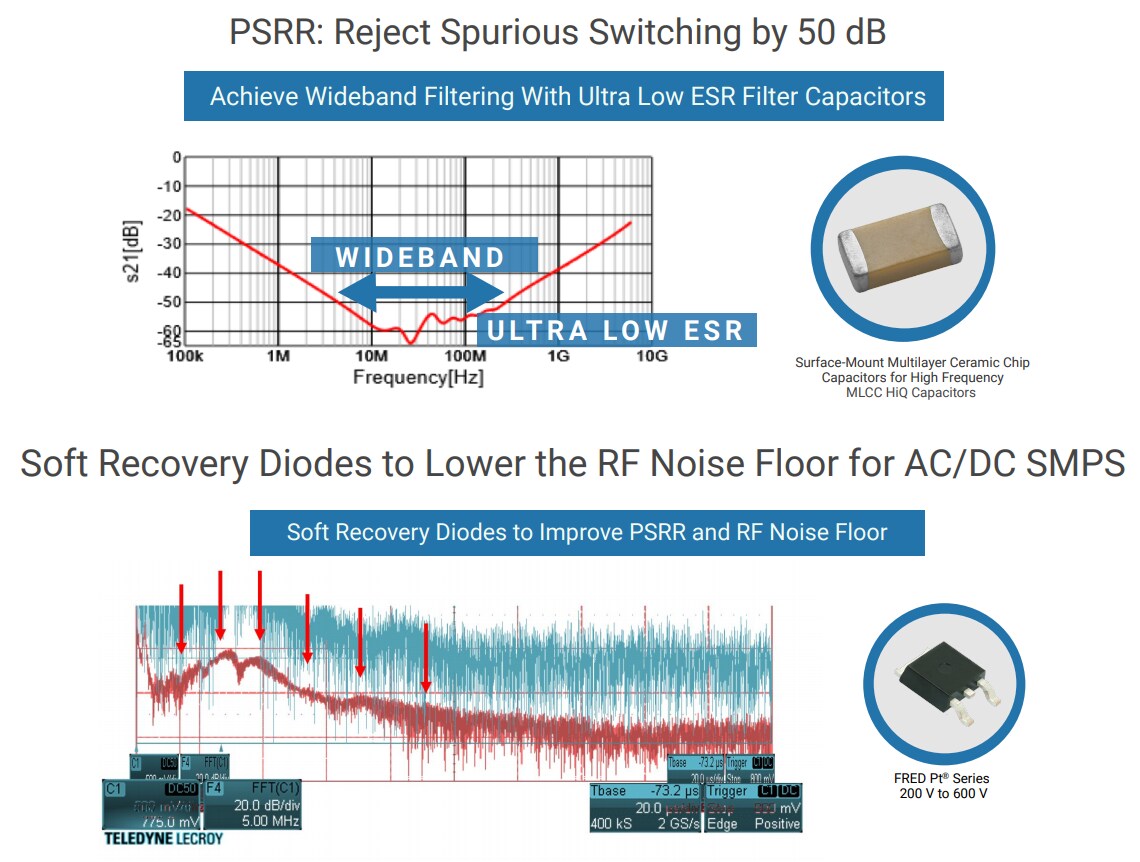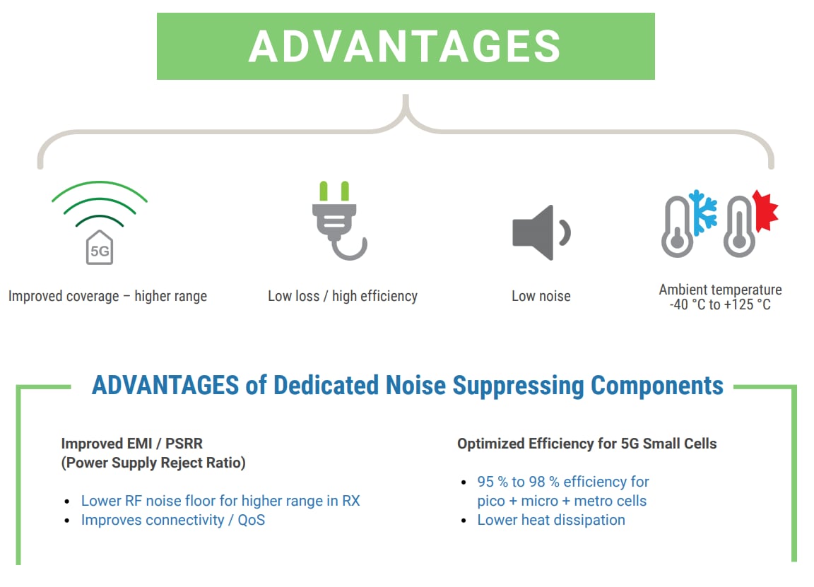 Vishay 5G Power Supply Solutions are a portfolio of devices that offer the highest efficiency and RF noise levels for 5G mmWave base station applications. They have a high operating temperature range from -40°C to +125°C. Wideband filtering can be achieved with ultra-low ESR filter capacitors, and soft recovery diodes improve PSRR and RF noise floor.