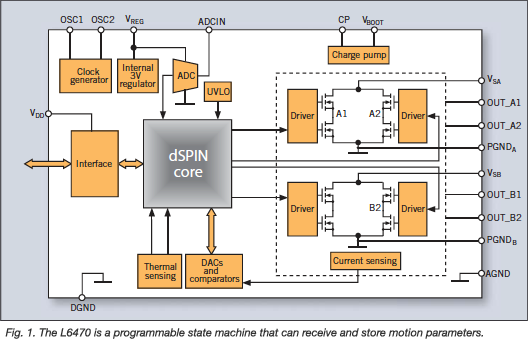 A new controller IC, the L6470 for stepper motors, integrates the power stage along with a digital control core on a monolithic IC. The device can receive motion profile commands across the SPI interface and autonomously execute the complete movement using the programmed acceleration and speed profile. It can also autonomously accelerate the motor up and keep it running at a programmed speed.