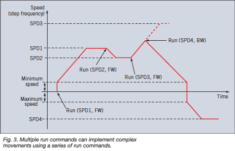 Complex movements can be performed using a series of run commands, as shown in Fig. 3. Each time a new run command is received the device will accelerate, or decelerate, the motor to the new commanded speed and continue to run at that speed until the next run command or a stop command is received. When a command is received to reverse the direction of movement, the motor is decelerated down to the minimum speed and then accelerated up to speed in the opposite direction.