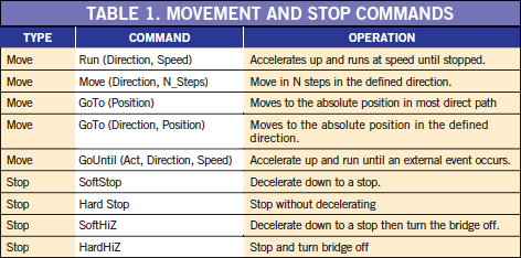 An SPI interface receives all the motion parameters and the movement commands. The commands, like move forward a number of steps, are interpreted by the control logic that controls the output step time and number of steps to accelerate the motor from the starting speed to the running speed and back down to stop while moving the total number of steps commanded. Complex movements can be made by programming queuing up and sending a set of movement commands to be sent across the SPI to the device.