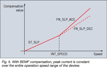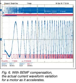 If the same peak voltage is supplied to the motor over the entire speed range, the current would go down as the speed increases since the BEMF of the motor effectively reduces the voltage applied to the coil. The waveforms on the left of Fig. 4 show the operation of the motor without BEMF compensation. As the speed increased, the BEM increases linearly and, since the voltage across the coil is effectively the applied phase voltage minus the BEMF voltage, the current decreases.